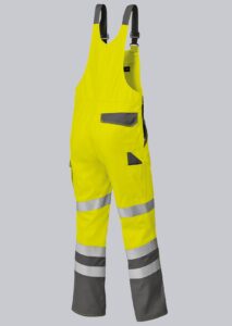 Bretelbroeken worden vaak gedragen in combinatie met werkshirts en veiligheidsschoenen.