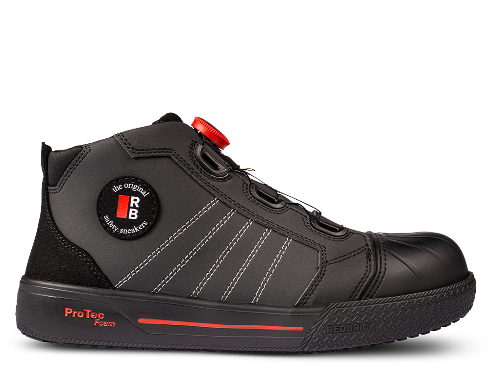 Sprint S3S van Redbrick. Hoog model. ESD. Veiligheidsneus: composiet. Bovenlaag: Microfiber. Zool: ProTec™ Foam (TPU + ETPU). Voering: 3D textiel mesh. Eigenschappen: S3S, SR, SC, FO. Uitneembare inlegzool. Met snelsluiting en TPU overneus.