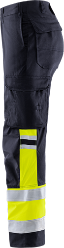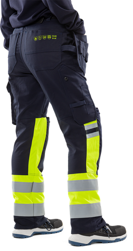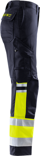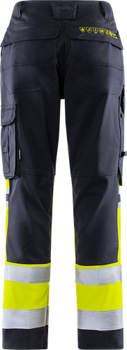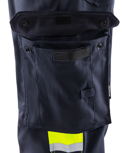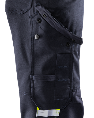 Multinorm stretchbroek voor dames van lichtgewicht en duurzaam materiaal met inherente vlambescherming. Uitzonderlijk zachte en comfortabele tegen vlammen beschermde high vis broek die superieure bewegingsvrijheid en een hoog beschermingsniveau biedt. Goedgekeurd voor industriële was en PFAS-vrij. Stretch materiaal / Waterafstotend / Verborgen knoop aan de voorkant / 2 voorzakken / 2 versterkte achterzakken met klep en verborgen drukknoopsluiting / Dubbele versterkte kruisnaad / Verstevigde zak voor duimstok en gereedschap met klep en verborgen drukknoopsluiting, penhouder en knoop en lus voor schede mes / Beenzak met klep en verborgen drukknoopsluiting, zak voor mobiele telefoon en lus voor ID-kaarthouder / Versterkte kniezakken met binnenopening / Hoogteverstelling voor kniebeschermers in kniezak / Metaalvrij / PFAS-vrij / Goedgekeurd volgens EN 61482-1-2 APC 1, EN 61482-1-1 ELIM: 8 cal/cm² (opgenomen in vlambooggecertificeerde kledingcombinaties), EN ISO 11612 A1 B1 C1 F1, EN 1149-5, EN ISO 11611 A1 klasse 1 (opgenomen in vlamboog- en laskledingcombinaties), EN 13034 Type PB [6], EN ISO 20471 klasse 1 en EN 14404 samen met kniebeschermers 124292 / Gecertificeerd na 50 wasbeurten / Wasgoed getest volgens ISO 15797 / OEKO-TEX® gecertificeerd. Stretch 45% modacryl, 34% katoen, 17% polyamide, 2% elastaan, 2% antistatische vezel Versterking 45% modacryl, 35% katoen, 18% polyamide, 2% antistatische vezel Inherente vlambescherming PFAS-vrij Stretch 265 g/m² Versteviging 300 g/m²
