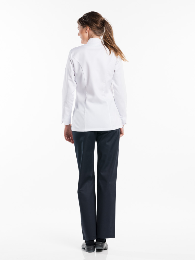 Deze ultieme Tailored Fit jas is speciaal ontwikkeld voor dames. De vrouwelijke variant is naast de charmante pasvorm identiek aan onze Comfort en Roma jacket. Dat betekent: een dubbele lijst met zichtbare drukknopen en een elegant afgewerkt manchet. De splitjes in de zij zorgen voor veel bewegingsvrijheid. De jas is in zowel wit als zwart verkrijgbaar. 65%PL/35%CO