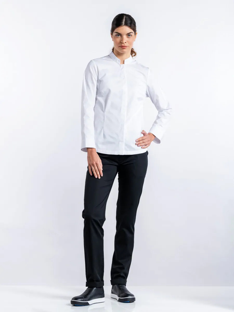 Speciaal ontworpen voor de vrouwelijke chef, met een stijlvolle tailored fit dankzij coupenaden. De jas heeft een moderne, korte opstaande kraag en sluit met handige drukknopen. Net zoals de mannenvariant is deze koksbuis voorzien van een praktische lus in de nek, ideaal om je schort aan te bevestigen. Een minimalistisch ontwerp dat comfort, functionaliteit en stijl samenbrengt – klaar om door jou in de keuken te worden gedragen. De getailleerde pasvorm zorgt voor een flatterende uitstraling, terwijl de blinde sluiting middenvoor een strakke look creëert. 67%PL/33%CO