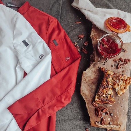 Sobere en efficiénte stijl voor deze mannelijke keukenjas die vlot aangepast wordt dankzij de regelbare gemaksbalg achteraan.