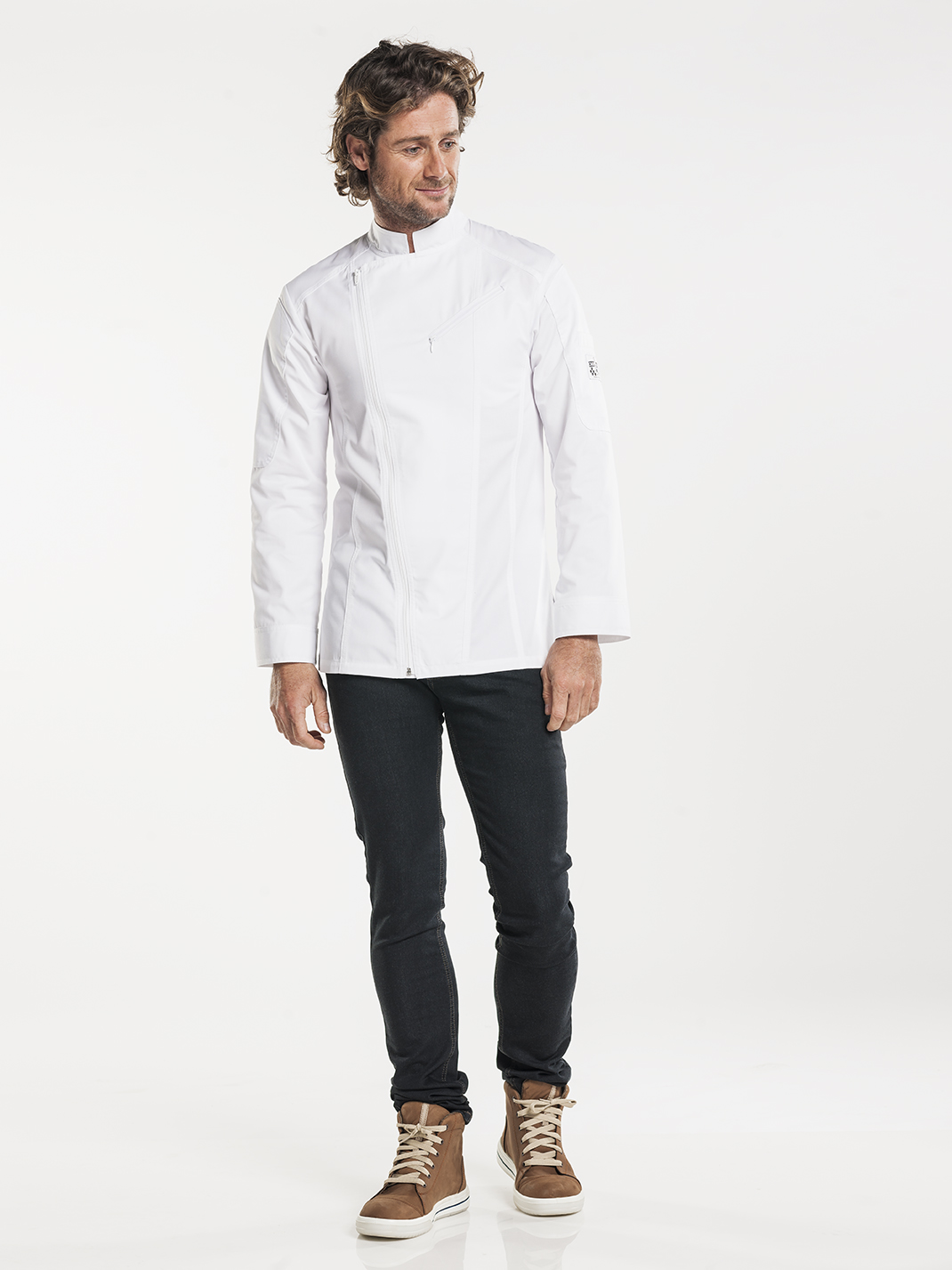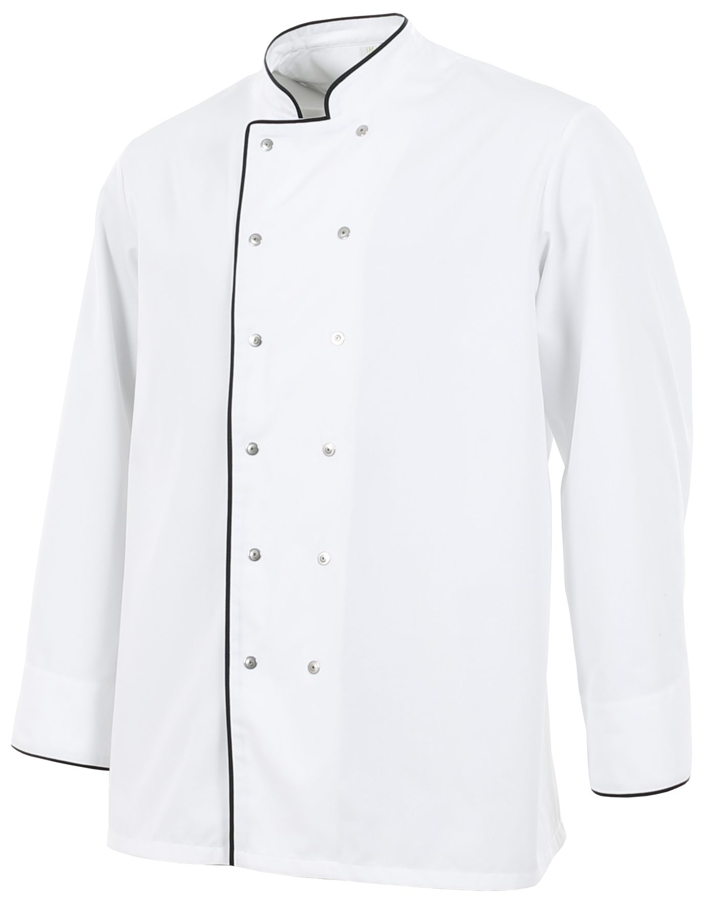 Een mannelijke en makkelijk te onderhouden keukenjas met gekleurde kraag en bies, voor een moderne uitstraling. 3 kleuren beschikbaar voor een grotere personalisatie.