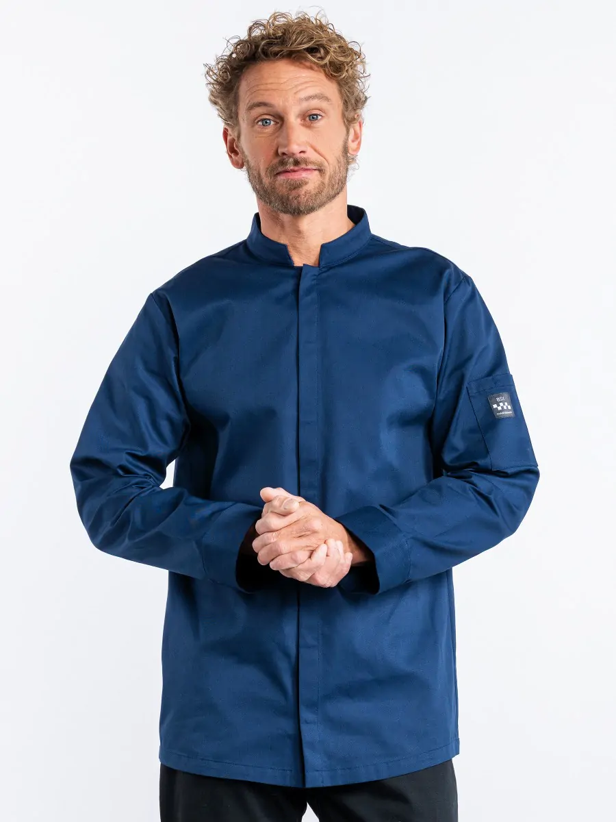 De snap heren keukenjas heeft een sobere, elegante uitstraling met zijn opstaande kraag.