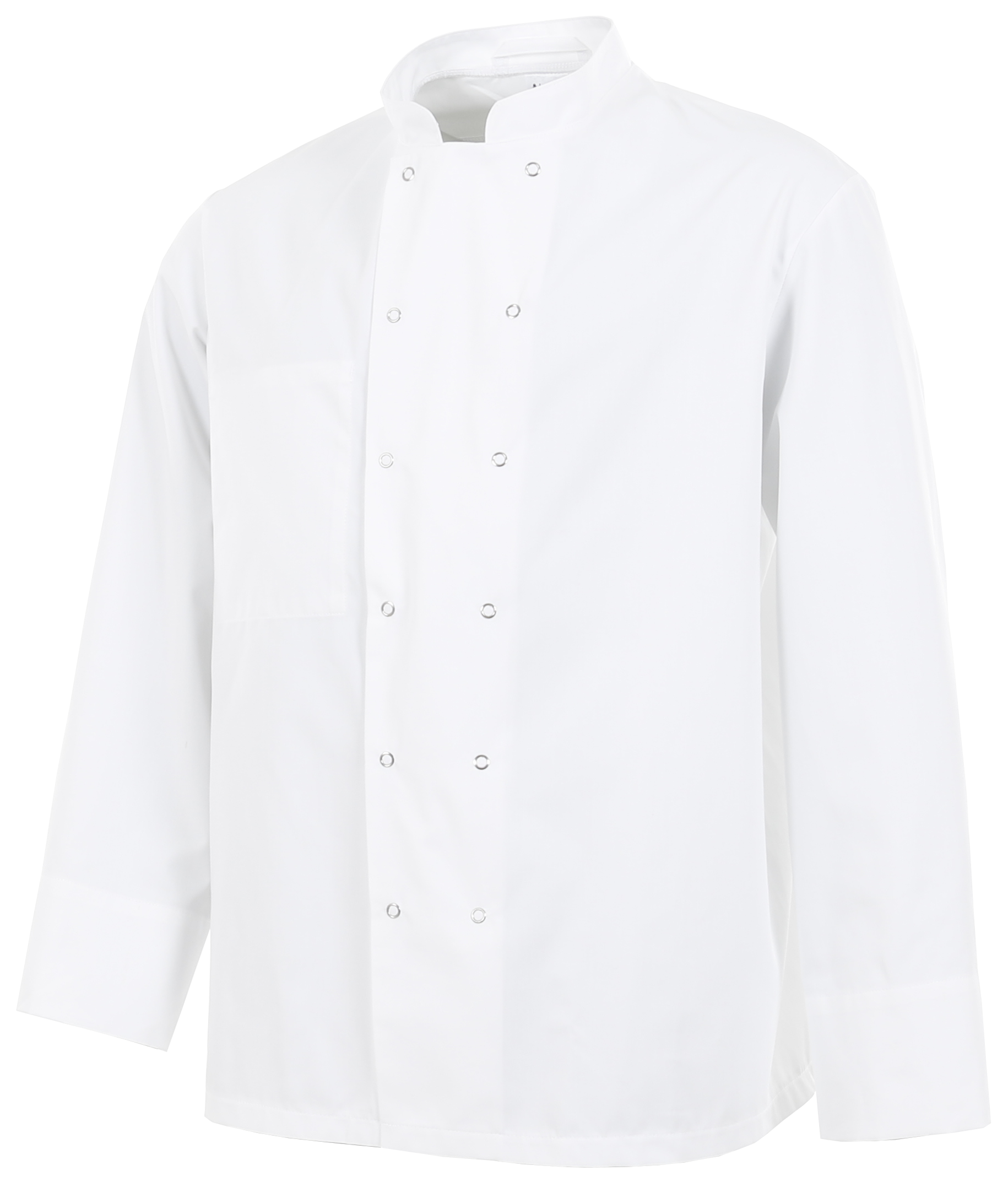 1/1 mouw met manchetten, opstaand boord, dubbele rij knoopsgaten voor 6 paar bolknopen (apart bestellen), ventilatieopeningen, los bijgevoegde borstzak, biezen in contrasterende kleur mogelijk (behalve het artikelnummer van de koksbuis s.v.p. ook het artikelnummer van de gewenste kleur bies opgeven). 200,00 g/m², gemengd weefsel met stretch, 48% Katoen, 48% Polyester, 4% Elastolefine. 1/1 mouw met manchetten. verstevigde staande kraag, dubbele rij knoopsgaten, normale pasvorm