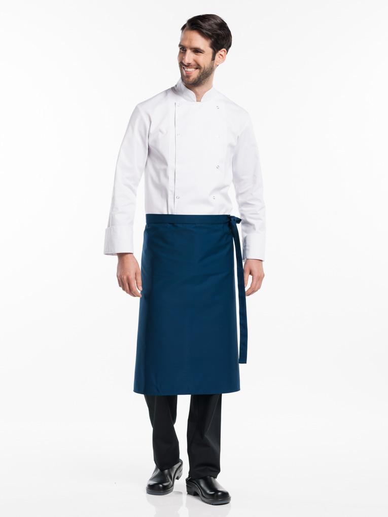 Een gemengde service schort, makkelijk te onderhoud en in één maat: one size fits all. De split zorgt voor een grote bewegingsvrijheid.