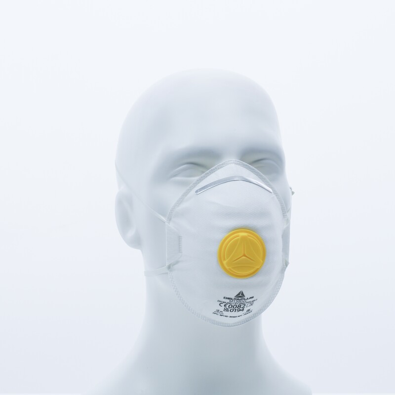 P2 wegwerpmasker met ventiel. Material : Synthetisch niet-geweven – Gegoten | Neusclip : Staal | Aansluitsysteem : Flenzen | Doos van 10 Comfort: Verstelbare neusbrug voor perfecte pasvorm en comfort | Prestaties: Hoogwaardig membraan voor een betere afvoer van vocht en warmte voor een groter gebruikscomfort | Makkelijk te gebruiken: Clipsluiting aan de achterkant EN 149 : FFP2