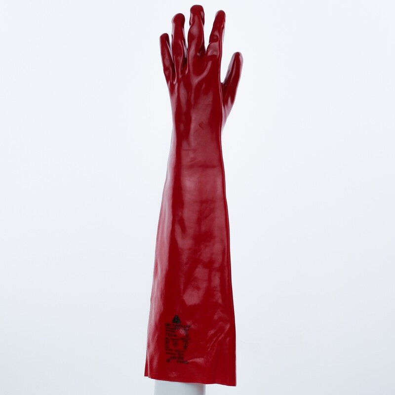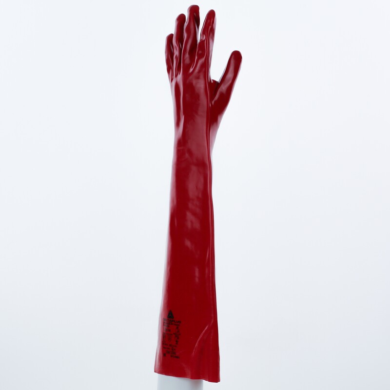 Chemische handschoen die de hele arm beschermt tegen oliën en koolwaterstoffen bij langdurig gebruik. Ondersteuning : Katoen | Coating : Gladde pvc – Volledig coating | Dikte : 1,20 mm | Lengte : 600 mm Prestaties: Zeer dik en lang voor versterkte bescherming van de arm in zijn geheel EN 388 : 4131X. EN 374 TYPE : B – AKL