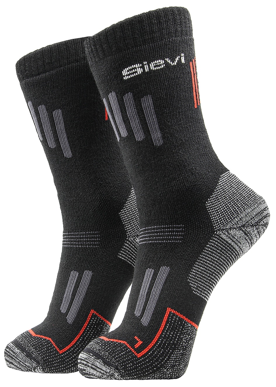 Goedzittende, warme, merinowollen technische wintersok. Langere levensduur door Cordura-materiaal. De sok zit uitstekend om de voet en is fijn om te dragen, ook bij lange werkdagen. ESD-goedgekeurd. De merinowol is mulesing-vrij. Materialen: 43% polyester, 29% polyamide, 19% merinowol, 6% Cordura-polyamide, 2% elastaan en 1% koolstofvezel. Machinewasbaar op 40°C, niet trommeldrogen.