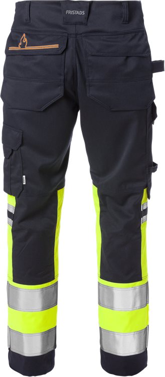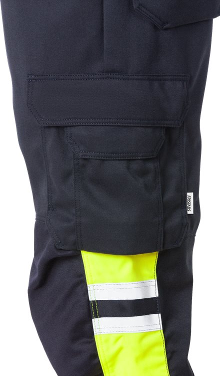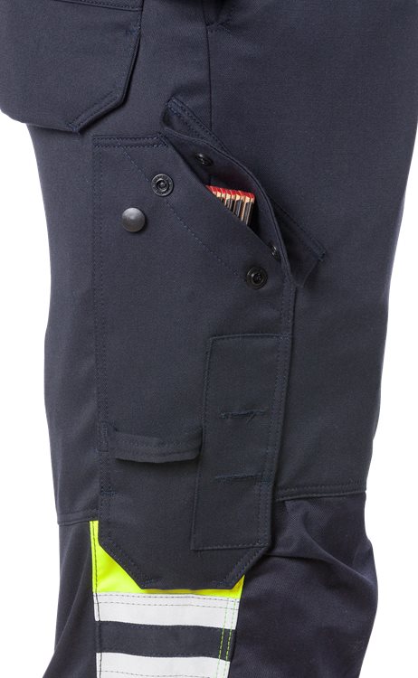 Vlambeschermende broek van een lichtgewicht en duurzaam materiaal met 4-way stretch. Broek met hoge zichtbaarheid en inherente vlambescherming die zowel een optimale bescherming als maximale bewegingsvrijheid biedt. Goedgekeurd voor 50 industriële wasbeurten. Stretchmateriaal. Vuil-, olie- en waterafstotend. 2 voorzakken . 2 met CORDURA® verstevigde achterzakken met klep en verdekte drukknoopsluiting. Dubbele kruisnaad. Hamerlus. Met CORDURA® verstevigde duimstokzak met klep en verdekte drukknoopsluiting, knoop en lus voor werkmes. Beenzak met klep en verdekte drukknoopsluiting, telefoonzak met klep en klittenbandsluiting, D-ring onder de klep. Met CORDURA® verstevigde kniezakken met opening aan de binnenzijde. Kniezakken voor in hoogte verstelbare kniebeschermers. Met CORDURA® verstevigde uiteinden van de broekspijpen. Verstevigde, dubbele stiksels op reflectietape. Goedgekeurd volgens EN 14404 samen met kiebeschermers 124292, EN 61482-1-2 Klasse 1, EN 61482-1-1 EBT: 10,3 cal. cm2 HAF: 80% (zie tabel voor vlamboog gecertificeerde kledingcombinaties volgens EN 61482-1-2 klasse 2 en open arc volgens EN 61482-1-1) , EN ISO 11612 A1 B1 C1 F1, EN 1149-5, EN ISO 11611 A1 Klasse 1, EN 13034 type PB [6], EN ISO 20471 Cl 2. Goedgekeurd na 50 wasbeurten/ Getest voor industrieel wassen volgens ISO 15797. OEKO-TEX® gecertificeerd. IEC 61482-2 Electrische vlamboog “Box en Open arc test”. gecertificeerde beschermende kleding. EN 11612 Hitte en vlammen. Gecertificeerde beschermende kleding. EN ISO 11611 Lassen en aanverwante processen. Gecertificeerde beschermende kleding. EN 1149 Electrostatische eigenschappen, ontwerp-eisen. Gecertificeerde beschermende kleding. EN 13034 Vloeibare chemicaliën, beperkte bescherming. Gecertificeerde beschermende kleding. EN 20471 Hoge zichtbaarheidskleding. Gecertificeerde beschermende kleding. EN 14404 Kniebescherming. Gecertificeerde beschermende kleding. ISO 15797 Industriële wasbaarheid. Test van werkkleding. 45% modacryl, 34% katoen, 17% polyamide, 2% elasthaan, 2% antistatische vezel. Inherente vlambescherming. 265 g/m².