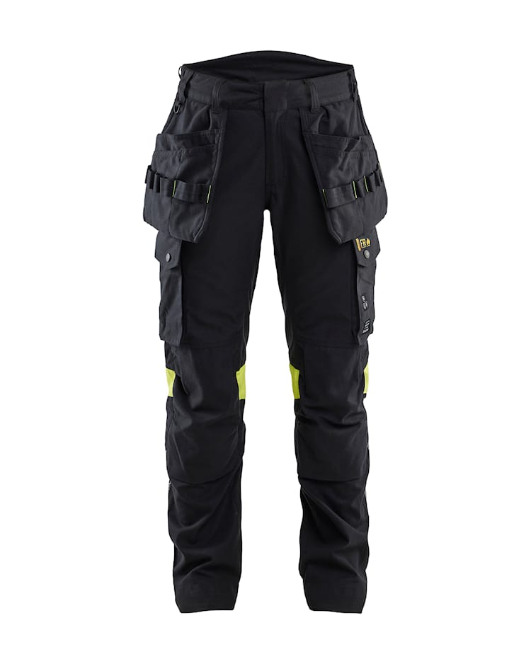 Vlambeschermende werkbroek van lichtgewicht en duurzaam materiaal met 4-way stretch. Broek met hoge zichtbaarheid en inherente vlambescherming die zowel een optimale bescherming als maximale bewegingsvrijheid biedt. Goedgekeurd voor 50 industriële wasbeurten. Stretchmateriaal. Vuil-, olie- en waterafstotend. 2 voorzakken. 2 met CORDURA® verstevigde, loshangende zakken, 1 met 3 kleine zakken en gereedschapslussen en 1 met 1 extra zak. 2 met CORDURA® verstevigde achterzakken, één met klep en verdekte drukknoopsluiting. Dubbele kruisnaad. Hamerlus. Met CORDURA® verstevigde duimstokzak met pennenhouder en knoop en lus voor werkmes.. Beenzak met klep en verdekte drukknoopsluiting, telefoonzak met klep en klittenbandsluiting, D-ring onder de klep. Met CORDURA® verstevigde kniezakken met opening aan de binnenzijde. Kniezakken voor in hoogte verstelbare kniebeschermers. Met CORDURA® verstevigde uiteinden van de broekspijpen. Verstevigde, dubbele stiksels op reflectietape. Goedgekeurd volgens EN 14404 samen met kniebeschermers 124292, EN 61482-1-2 klasse1, EN 61482-1-1 EBT: 10,3 cal/cm2 HAF: 80% (zie tabel voor vlamboog gecertificeerde kledingcombinaties volgens EN 61482-1-2 klasse 2 en open arc volgens EN 61482-1-1), EN ISO 11612 A1 B1 C1 F1, EN 1149-5 en EN ISO 20471 Cl 1. Stof is goedgekeurd volgens EN 13034 . Goedgekeurd na 50 wasbeurten. Getest voor industrieel wassen volgens ISO 15797. OEKO-TEX® gecertificeerd. IEC 61482-2 Electrische vlamboog “Box en Open arc test”. gecertificeerde beschermende kleding. EN 11612 Hitte en vlammen. Gecertificeerde beschermende kleding. EN 1149 Electrostatische eigenschappen, ontwerp-eisen. Gecertificeerde beschermende kleding. EN 20471 Hoge zichtbaarheidskleding. Gecertificeerde beschermende kleding. EN 14404 Kniebescherming. Gecertificeerde beschermende kleding. ISO 15797 Industriële wasbaarheid. Test van werkkleding. 45% modacryl, 34% katoen, 17% polyamide, 2% elasthaan, 2% antistatische vezel. Inherente vlambescherming. 265 g/m².