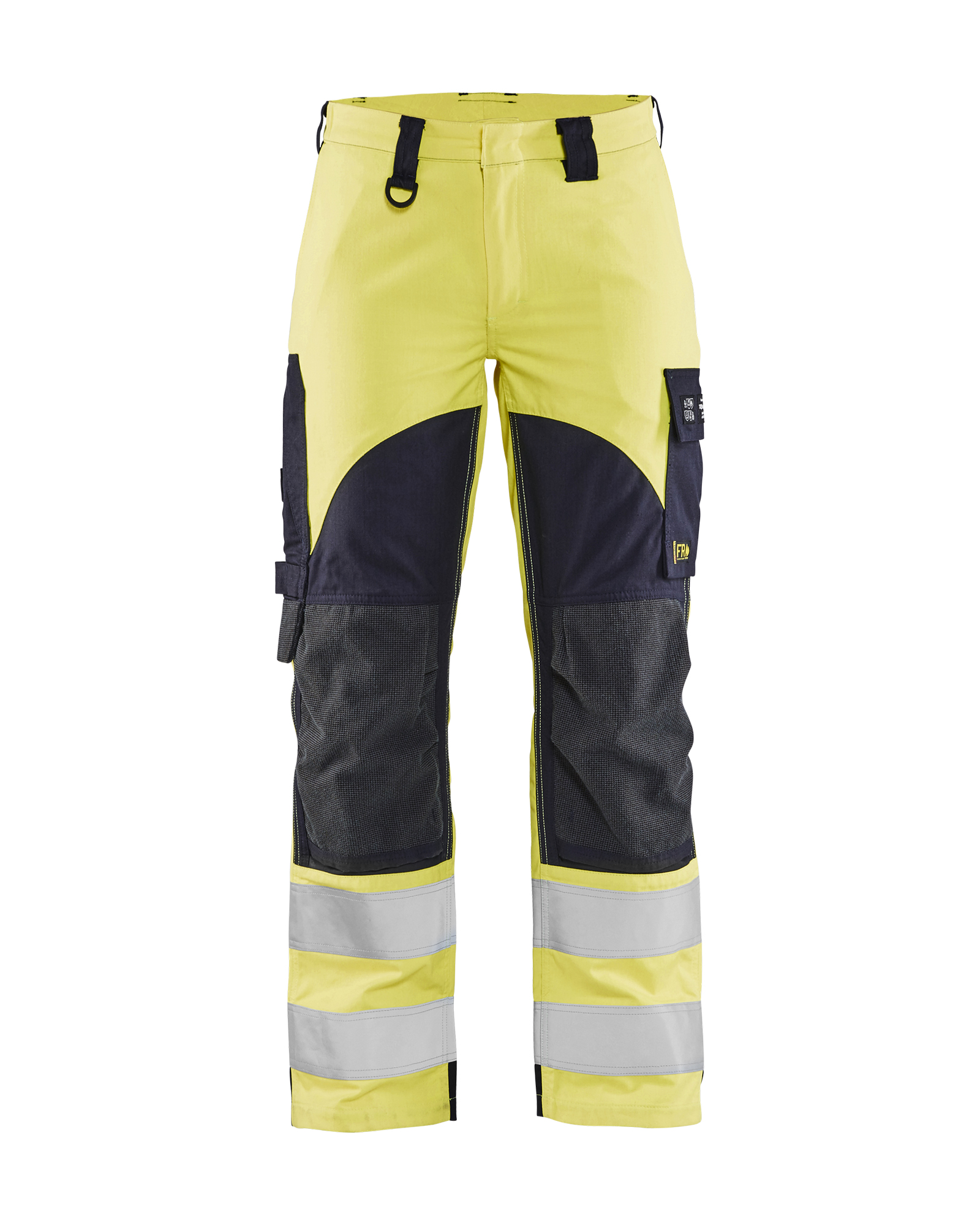 Persoonlijke beschermende werkbroek met symmetrische beenzakken. De broek heeft klasse 2 zichtbaarheid en biedt bescherming tegen hitte en vuur, antistatische en elektrische vlambogen voor veiligheid op risicovolle werkplekken en in gevaarlijke omgevingen. Gecertificeerde bescherming voor lassen. DuPont™ Kevlar® versterkte symmetrische beenzakken. KneeGuard™ systeem gecertificeerd volgens EN 14404. Voorgebogen pijpen en inzet in het kruis uitstekende bewegingsvrijheid. Symmetrische beenzakken geschikt voor zowel links- als rechtshandigen. . . Basis: 49% modacryl FR, 42% katoen, 5% aramide, 3% polyamide, 1% antistatisch, 300 g/m². Versterking: 39% modacryl, 28% CORDURA®, 17% katoen, 15% aramide, 1% antistatisch, 270 g/m².