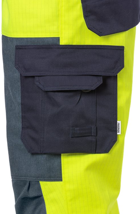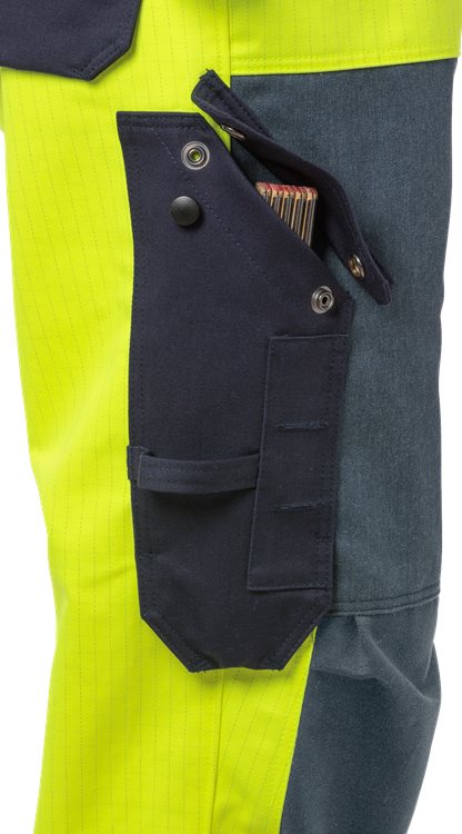 Vlamwerende high-vis Amerikaanse overall goedgekeurd voor het lassen. Gemaakt van een duurzaam en comfortabel vlamvertragend behandeld materiaal met Aramide en CORDURA versterkingen. Goedgekeurd voor industriël wassen. Elastische bretels. Borstzak met klep en verdekte drukknoopsluiting. Binnenzak met rits. 2 voorzakken. Verstelbare taille door middel van knopen. Gulp met ritssluiting. Dubbel verstevigde kruisnaad. 2 met CORDURA® verstevigde achterzakken met klep en verdekte drukknoopsluiting. Met CORDURA® verstevigde duimstokzak met klep en drukknoopsluiting en knoop en lus voor werkmes. Beenzak met klep en verdekte drukknoopsluiting, telefoonzak met klep en klittenbandsluiting, D-ring. Hamerlus. Met aramide verstevigde delen op het bovenbeen. Aramide verstevigde kniezakken met binnenopening. Hoogteverstelling voor kniebeschermers in kniezak. Met CORDURA® verstevigde uiteinden van de broekspijpen. Goedgekeurd volgens EN 61482-1-2 klasse 1, EN 61482-1-1 ATPV 10,6 cal/cm² HAF 80,4% (zie tabel voor vlamboog gecertificeerde kledingcombinaties volgens EN 61482-1-2 klasse 2 en open arc volgens EN 61482-1-1), EN ISO 11612 A1 B1 C1 E2, EN ISO 11611 A1 klasse 1, EN 1149-5, EN ISO 20471 klasse 2 en EN 14404 samen met kniebeschermers 124292. Goedgekeurd na 50 wasbeurten. Getest voor industrieel wassen volgens ISO 15797. OEKO-TEX® gecertificeerd. IEC 61482-2 Electrische vlamboog “Box en Open arc test”. gecertificeerde beschermende kleding. EN 11612 Hitte en vlammen. Gecertificeerde beschermende kleding. EN ISO 11611 Lassen en aanverwante processen. Gecertificeerde beschermende kleding. EN 1149 Electrostatische eigenschappen, ontwerp-eisen. Gecertificeerde beschermende kleding. EN 20471 Hoge zichtbaarheidskleding. Gecertificeerde beschermende kleding. EN 14404 Kniebescherming. Gecertificeerde beschermende kleding. ISO 15797 Industriële wasbaarheid. Test van werkkleding. 75% katoen, 24% polyester, 1% antistatische vezel. Versteviging: 74% katoen, 25% para-aramide, 1% antistatische vezel. Polyamide versteviging: 79% katoen (vlamvertragend), 20% polyamide, 1% antistatische vezel. 365 g/m². Reinforcement 340 g/m².