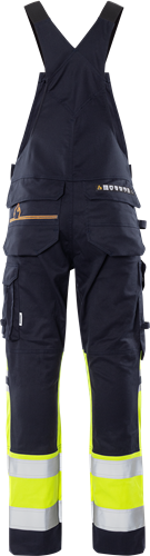 Tegen vlammen beschermde Amerikaanse overall van lichtgewicht en duurzaam stretchmateriaal. High Vis met inherente vlambescherming die zowel optimale veiligheid als superieure bewegingsvrijheid biedt. Stretchstof. Vuil-, olie- en waterafstotend. Elastische bretels. Broekzak met klep en verborgen drukknoopsluiting. Binnenbroekzak met rits. Verstelbare taille met knopen. Gulp met rits. 2 voorzakken. 2 CORDURA®-versterkte achterzakken met klep en verborgen drukknoopsluiting. Dubbel versterkte kruisnaad. Hamerlus. CORDURA®-verstevigde duimstokzak met klep en verborgen drukknoopsluiting, knoop en lus voor schede mes en pennenhouder. Beenzak met klep en verborgen drukknoopsluiting, zak voor mobiele telefoon en lussen voor id-kaarthouder. CORDURA®-verstevigde kniezakken met binnenopening. Hoogteverstelling voor kniebeschermers in kniezak. CORDURA®-verstevigde beenuiteinden. 2-naalds stiksel op reflecterende tape. Goedgekeurd volgens EN 61482-1-2 APC 1, EN 61482-1-1 ELIM: 8 cal/cm² (zie vlamboogtabel voor gecertificeerde kledingcombinaties voor EN 61482-1-2 APC 2 en open boog volgens EN 61482-1-1), EN ISO 11612 A1 B1 C1 F1, EN 1149-5, EN ISO 11611 A1 klasse 1 (zie vlamboog- en lastabel voor gecertificeerde kledingcombinaties), EN 13034 Type PB [6], EN ISO 20471 klasse 1 en EN 14404 samen met kniebeschermers 124292. Goedgekeurd na 50 wasbeurten. Getest voor industrieel wassen volgens ISO 15797. OEKO-TEX® gecertificeerd. IEC 61482-2 Elektrische vlamboog. Inclusief ELIM waarde EN 11612 Hitte en vlammen EN ISO 11611 Lassen 45% modacryl, 34% katoen, 17% polyamide, 2% elastaan, 2% antistatische vezel Inherente vlambescherming 265 g/m²