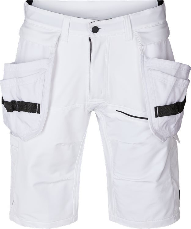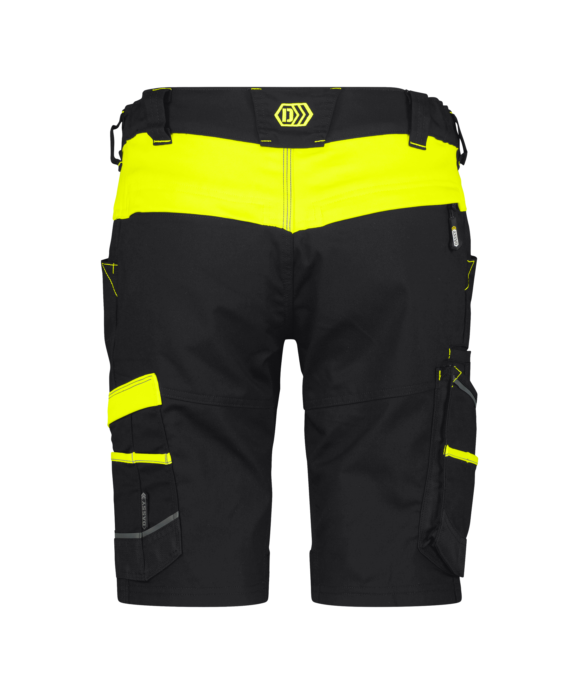 65% polyester/35% katoen, +/- 245 g/m², 4-way stretch aan de achterkant onder de tailleband en in het kruis, steekzakken, open achterzak, achterzak met ritssluiting, dijbeenzakken, potloodzak, meterzak, breekmeszak, D-ring, veiligheidszak met ritssluiting, verstelbare rugelastiek, verlaagde taille, drienaaldstiksel, adjusted fit, stiksels in contrastkleur, verborgen jeansknoop en rits, fluo bartacks, reflecterende bies op de dijbeenzakken,