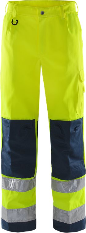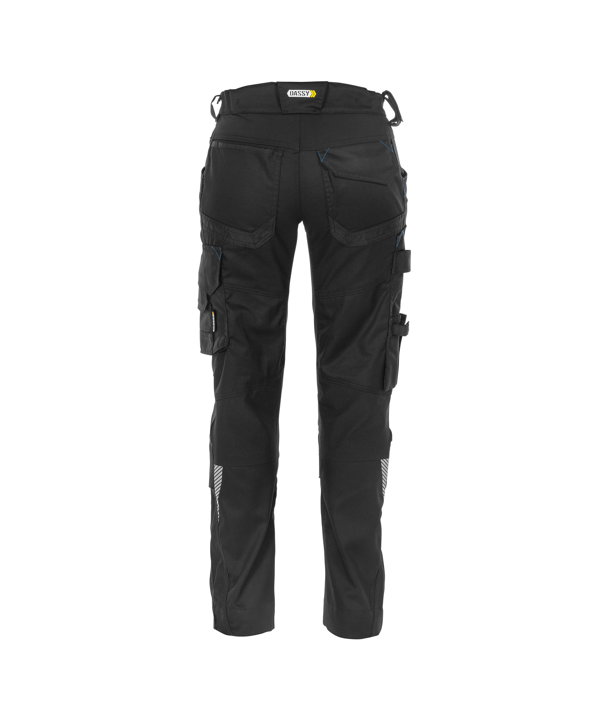 65% polyester/35% katoen, +/- 245 g/m², 4-way stretch in knieholte, in kruis en aan de achterkant onder de tailleband, verstelbare Cordura®Stretch-kniezakken, multifunctionele riemlus, zakken versterkt met Cordura®, steekzakken, achterzak met klep, open achterzak, dijbeenzak, potloodzak, meterzak, breekmeszak, knoop voor meshouder, D-ring, gsm-zak, afneembare ID-kaarthouder, veiligheidszak met ritssluiting, reflecterende details, verstelbare rugelastiek, elastische tailleband aan de zijkant, normale taillehoogte, drienaaldstiksel, adjusted fit, stiksels in contrastkleur, verlengbare zoom (extra 5 cm), verborgen jeansknoop en ritscertificatie EN 14404:2004+A1:2010 – verstelbare Cordura® kniezakken in combinatie met DASSY® CRATOS kniebeschermers.