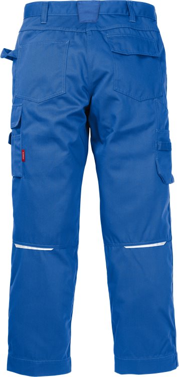 Broek met kniezakken voor industrieel werk van duurzame en comfortabele 100% katoen. Goedgekeurd voor industrieel wassen. Contrasterende stiksels. Lagere tailleband. Saddleback. Gulp met ritssluiting. Reflecterende details aan achterkant knieën. 5 cm verstelbare beenlengte. 2 zijzakken; de rechterzak heeft een geïntegreerde telefoonzak. Grote beenzak met klep – geplaatst over zijnaad – met telefoonzak met klep en pennenzakken. Dubbele zak voor duimstok over de zijnaad met pennenzakje. 2 zakken aan de achterkant, 1 met klep. Hamerlussen. Klepje in de taille voor streepjescode of chip. Kniezakken. Goedgekeurd volgens EN 14404 samen met kniebeschermers 124292. Getest voor industrieel wassen volgens ISO 15797. OEKO-TEX® gecertificeerd. EN 14404 Kniebescherming. Gecertificeerde beschermende kleding. ISO 15797 Industriële wasbaarheid. Test van werkkleding. 100% katoen. 350 g/m².