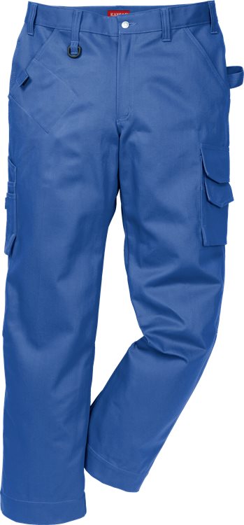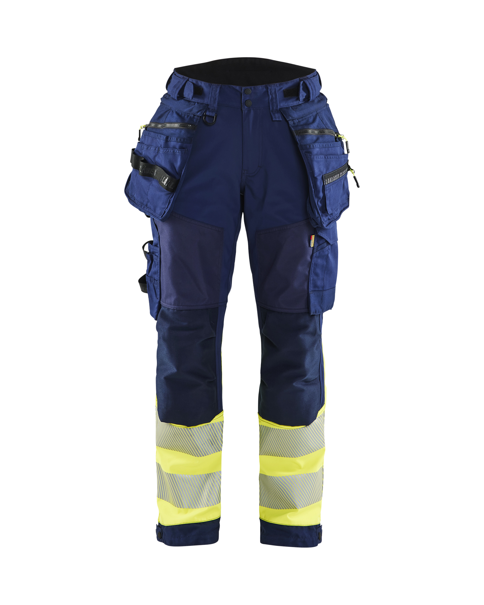 65% polyester/35% katoen, +/- 245 g/m², steekzakken, achterzakken met klep, dijbeenzak, meterzak, hamerlus, gsm-zak, lus voor ID-kaarthouder, reflecterende banden van 70 mm, verstelbare rugelastiek, regular fit, normale taillehoogte, drienaaldstiksel, verlengbare zoom (extra 5 cm), ritssluiting en jeansknoop, certificatie EN ISO 20471:2013+A1:2016 – klasse 1.