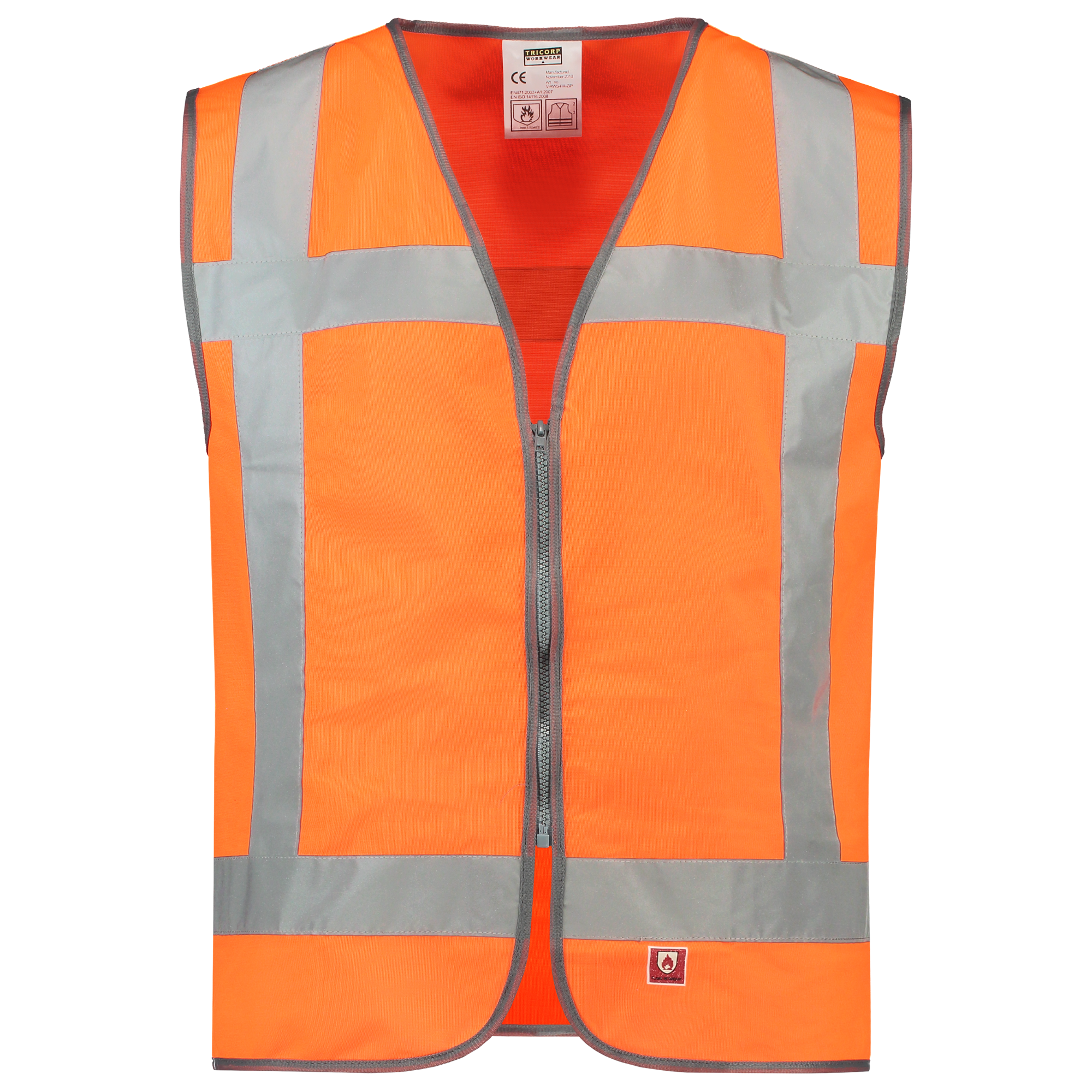 Dit veiligheidsvest voldoet aan de ISO 14116 index 1 normering en is daarmee zeer geschikt als een vlamvertragend kledingstuk. Bovendien worden de regels voor hoge zichtbaarheid conform de EN ISO 20471:2013, klasse 2 normering gehanteerd. Dit veiligheidsvest zorgt voor een hoge zichtbaarheid door de opvallende en reflecterende striping en de fluorescerendheid van het doek. Bij dit veiligheidsvest is ook de striping vlamvertragend. Tevens is dit veiligheidsvest uitgevoerd conform de richtlijnen van Rijkswaterstaat en beschikbaar in de kleuren fluor orange en fluor yellow.
