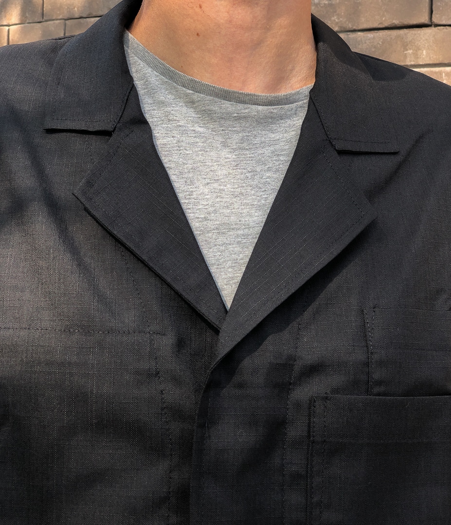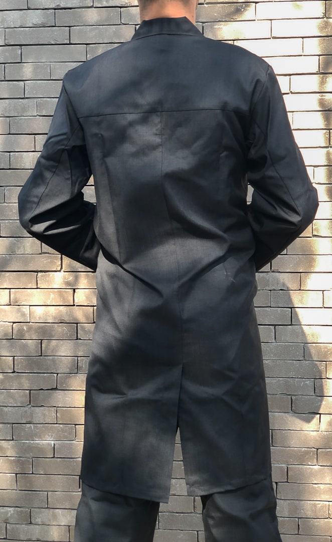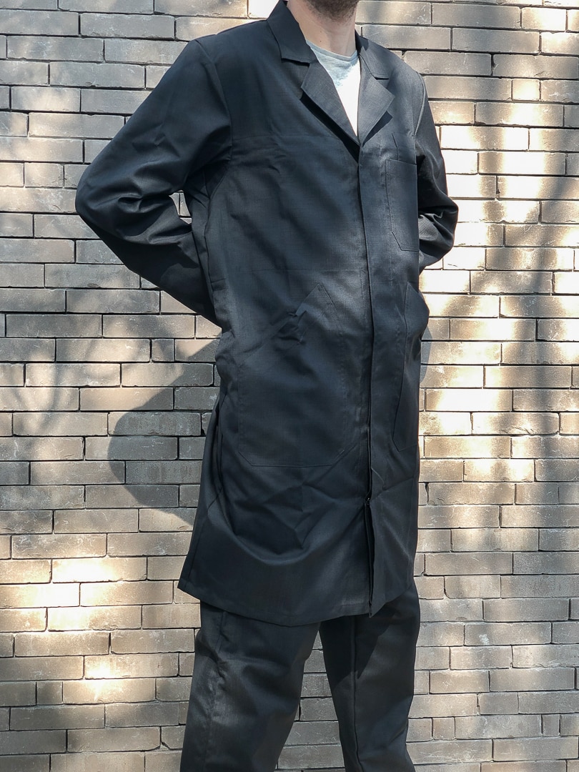 Franse veekoopmansjas met borst- en schaarzakje, doortasten naar broekzakken en binnenzak met rits. Lang model. 82% polyester – 18% viscose. Bijhorende broek apart beschikbaar.