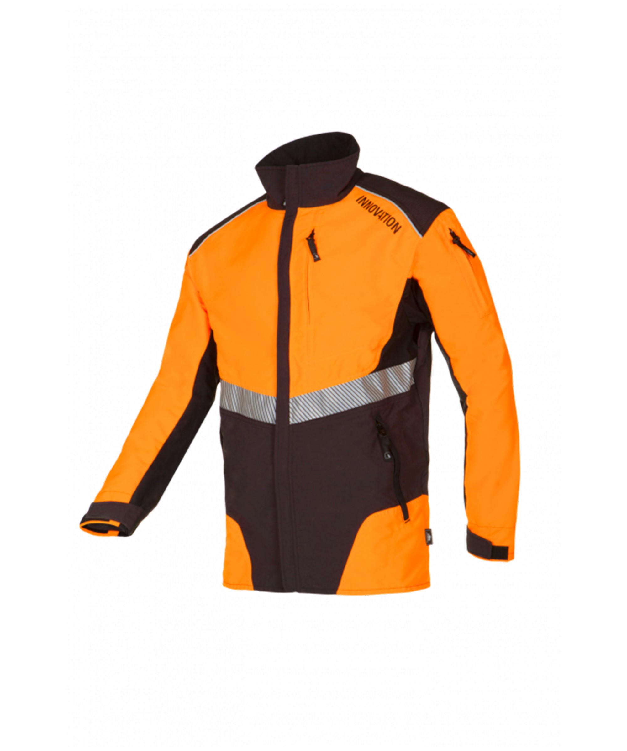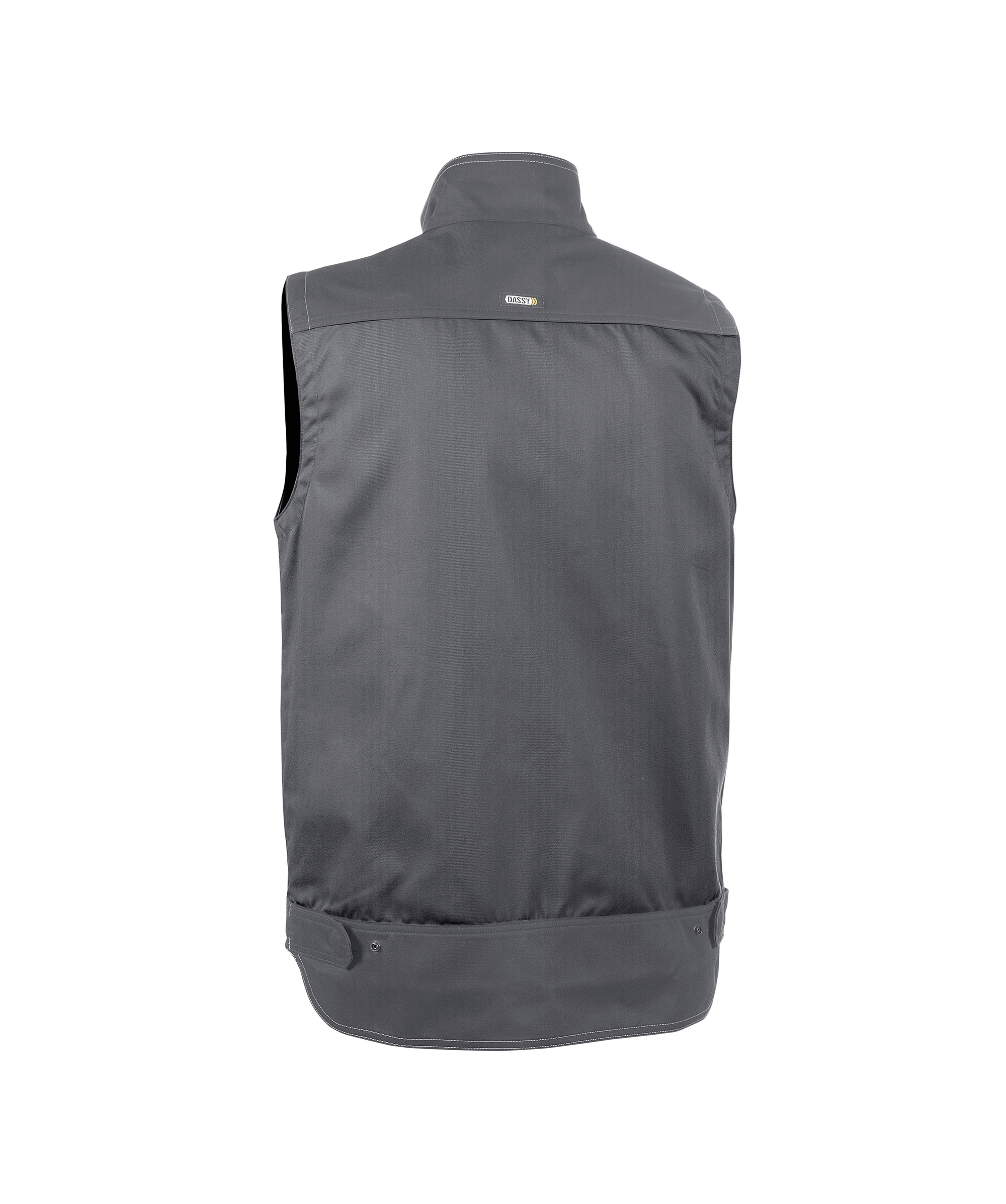 65% polyester/35% katoen, +/- 245 g/m², taille regelbaar met drukknopen, verborgen lange ritssluiting, verlengde rug, steekzakken, opgezette zakken met klep, borstzak, D-ring, gsm-zak, potloodzak, binnenzak, tweenaaldstiksel.