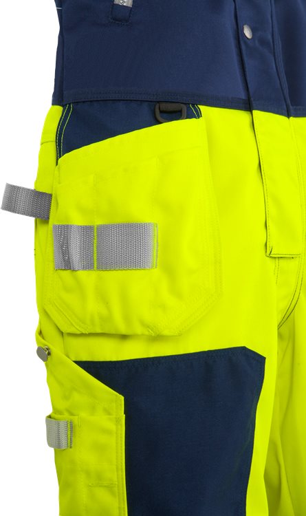 Comfortabele Amerikaanse overall van vuil-, olie- en waterafstotend materiaal met katoenen binnenkant. CORDURA®-verstevigingen en donkere kleur op blootgestelde gedeelten. Goedgekeurd voor industrieel wassen. Vuil-, olie- en waterafstotende stof. Tweewegrits aan de voorkant over de gehele lengte. Spijkerzakken verstevigd met CORDURA®. 2 loshangende borstzakken met drukknopen, 1 met klep en drukknopen en D-ring, 1 met drukknopen en pennenzak/ Knoop en lus voor werkmes. Elastische bretels. 2 loshangende, zakken aan de voorkant met knoop en lus voor werkmes/ linkerzak met extra zak en rechterzak met 3 zakken en gereedschapslussen. D-ring. 2 zakken aan de voorkant. 2 zakken aan de achterkant, 1 met klep en klittenbandsluiting. Beenzak met telefoonzakje en D-ring en ID-pas zakje. Hamerlus. Zak voor duimstok met gereedschapszak, en 2 knopen en lussen voor 2 werkmessen. Verstelbare taille met knopen. Verstevigde delen op de dijbenen in contrasterende kleur. Voorgevormde knieën. Met CORDURA® verstevigde kniezakken met opening aan de binnenzijde. Kniezakken voor in hoogte verstelbare kniestukken. Uiteinde van de pijpen verstevigd met CORDURA®. Waterafstotend. Geborstelde binnenzijde. Goedgekeurd volgens EN 14404 samen met kniebeschermers 124292 en EN ISO 20471 klasse 2. Goedgekeurd na 50 wasbeurten. Getest voor industrieel wassen volgens ISO 15797. OEKO-TEX® gecertificeerd. EN 20471 Hoge zichtbaarheidskleding. Gecertificeerde beschermende kleding. EN 14404 Kniebescherming. Gecertificeerde beschermende kleding. ISO 15797 Industriële wasbaarheid. Test van werkkleding. Fluorescerend materiaal: 80% polyester, 20% katoen. Overig materiaal: 65% polyester, 35% katoen. Verstevigingen: 100% polyamide. 300 g/m².