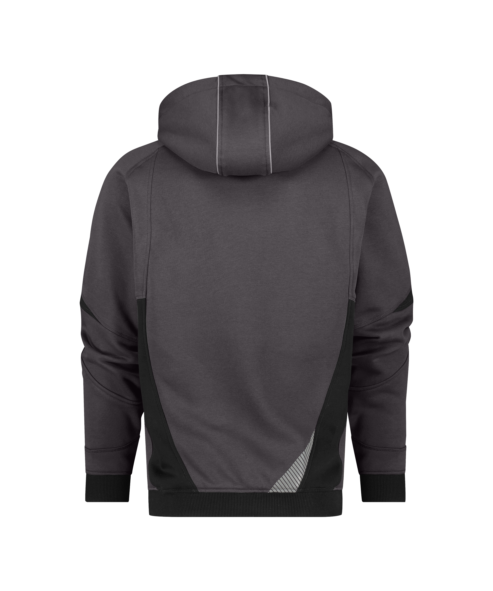 80% katoen/20% polyester, +/- 290 g/m², lange ritssluiting, kinbescherming bovenaan rits, steekzakken, verborgen veiligheidszak met ritssluiting, gebreide mouw- en heupboord, stiksels in contrastkleur, geschikt voor borduurwerk en bedrukking, gesegmenteerde reflecterende details, tweelaagse kap met reflecterende bies en regelbaar met elastische trekkoord.