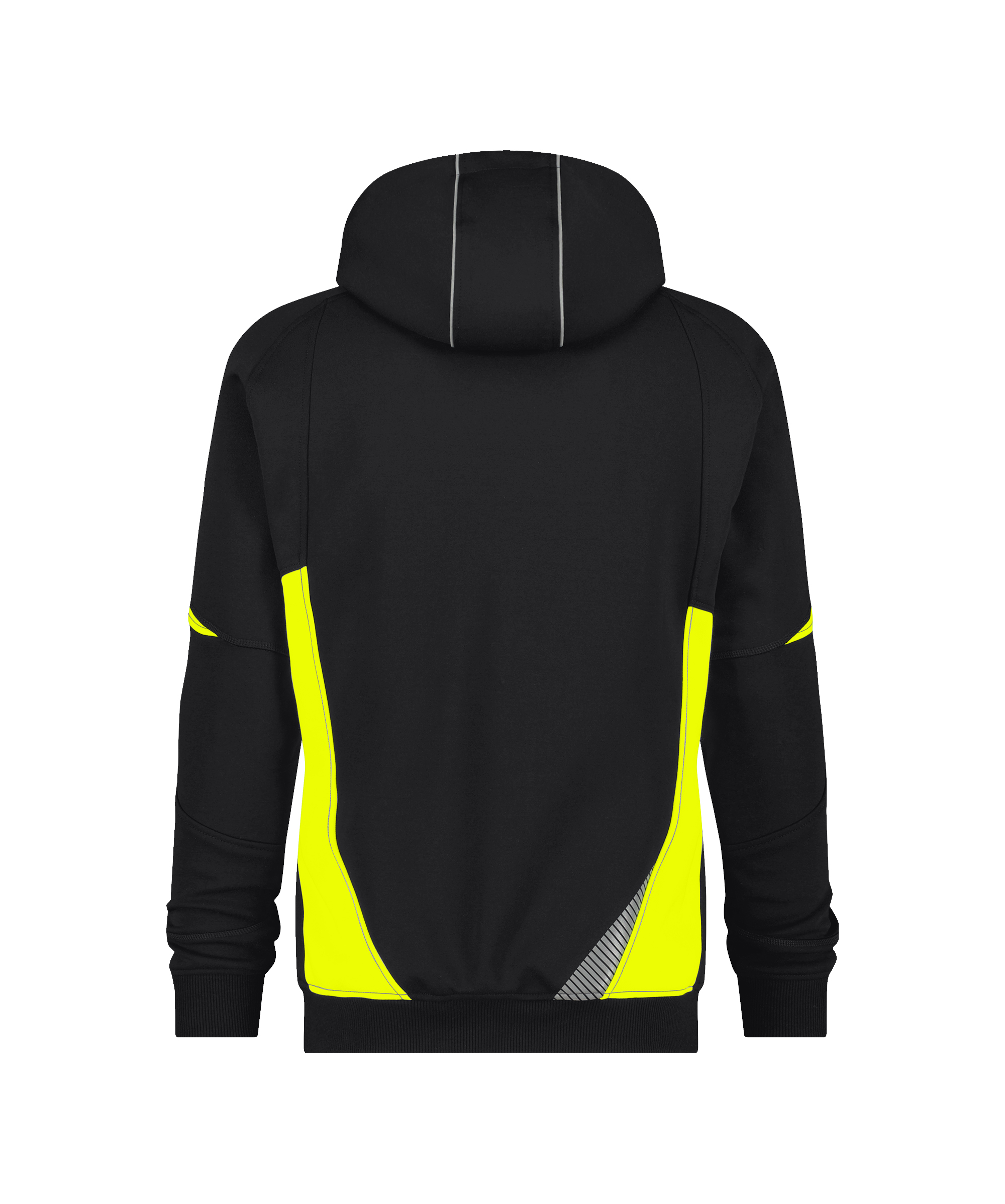 65% katoen/35% polyester, +/- 305 g/m², lange ritssluiting, kinbescherming bovenaan rits, steekzakken, verborgen veiligheidszak met ritssluiting, gebreide mouw- en heupboord, stiksels in contrastkleur, geschikt voor borduurwerk en bedrukking, gesegmenteerde reflecterende details, fluo bartacks, tweelaagse kap met reflecterende bies en regelbaar met elastische trekkoord,