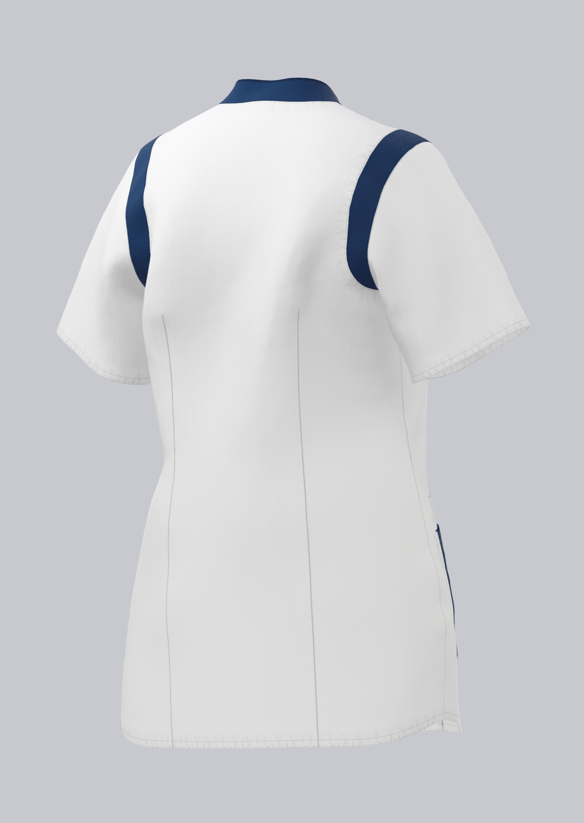 Getailleerd damesjack met opstaande boord, diverse zakken o.a. met telefoonzak, mouwomslag en zijsplitjes. Uitgevoerd in uni wit 65% polyester / 35% katoen